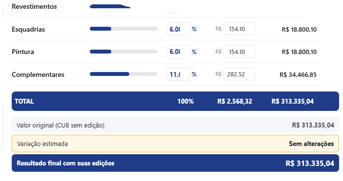 Se você sabe que vai gastar mais com revestimentos, você aumenta o percentual dessa etapa e vê o impacto na hora.